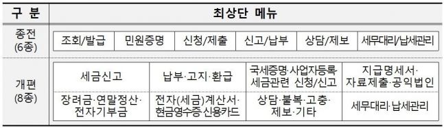 우선 메뉴체계를 손질했다. 840여종에 이르는 홈택스 서비스를 사용자 관점에서 분석하고 편의성을 고려해 메뉴를 재구성했다는 게 국세청의 설명이다. 종전의 '조회·발급, 신청·제출' 등 추상적인 명칭으로 구성된 최상단 메뉴(6종)를 납세자가 메뉴명만으로 쉽게 찾을 수 있도록 바꿨다. '세금신고, 납부·고지·환급, 장려금·연말정산·전자기부금, 전자(세금)계산서·현금영수증·신용카드' 등 직관적이게 개편한 것이다.